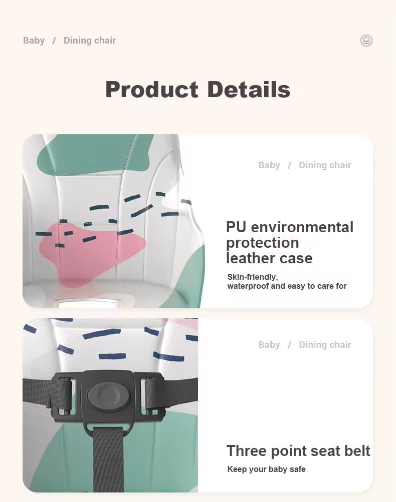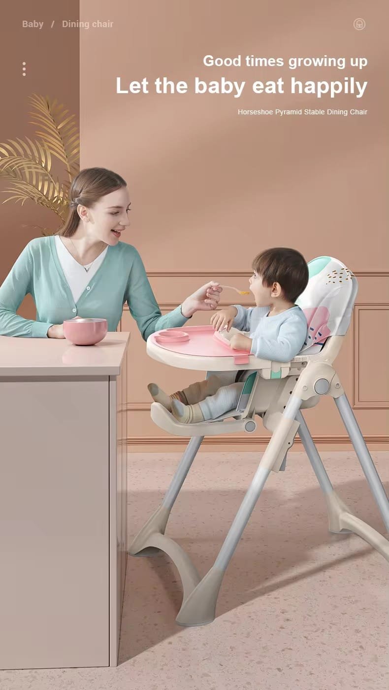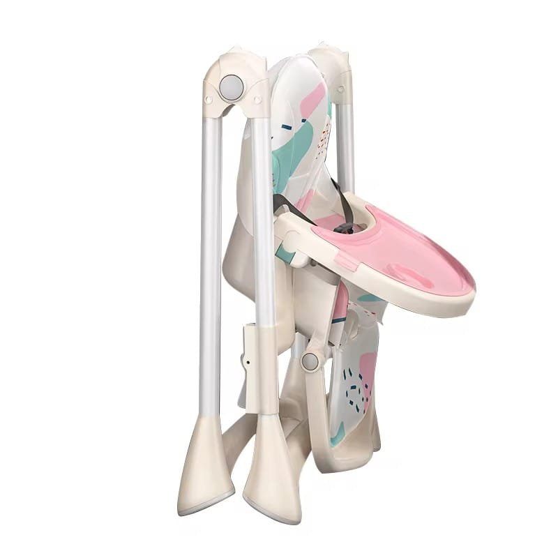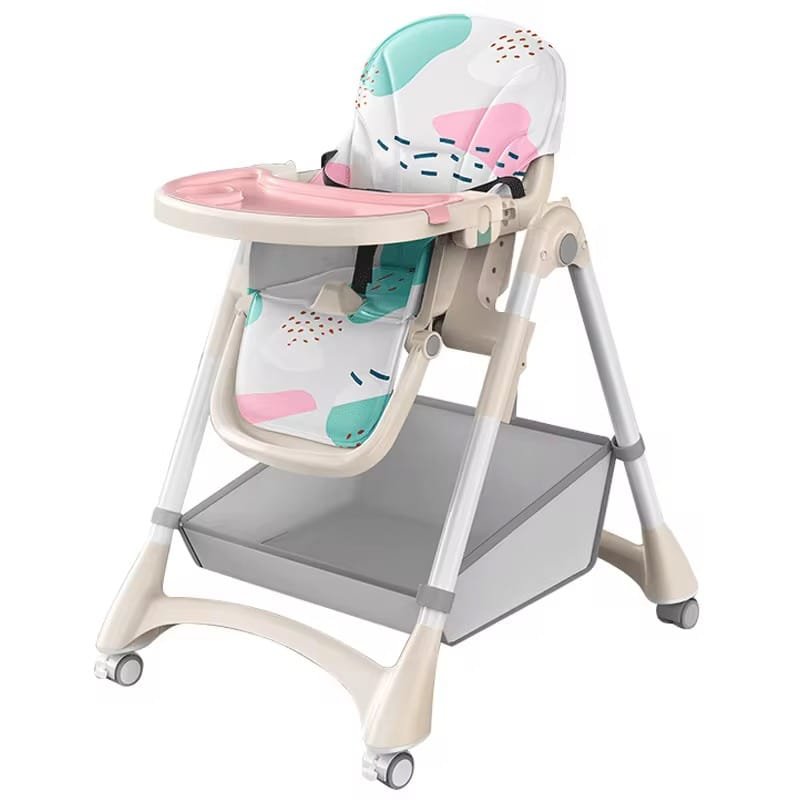 This foldable feeding chair with wheels has a 3-point safety harness which is designed to hold your baby securely around the waist. The 3 position adjustable tray gives more belly space for growing babies.